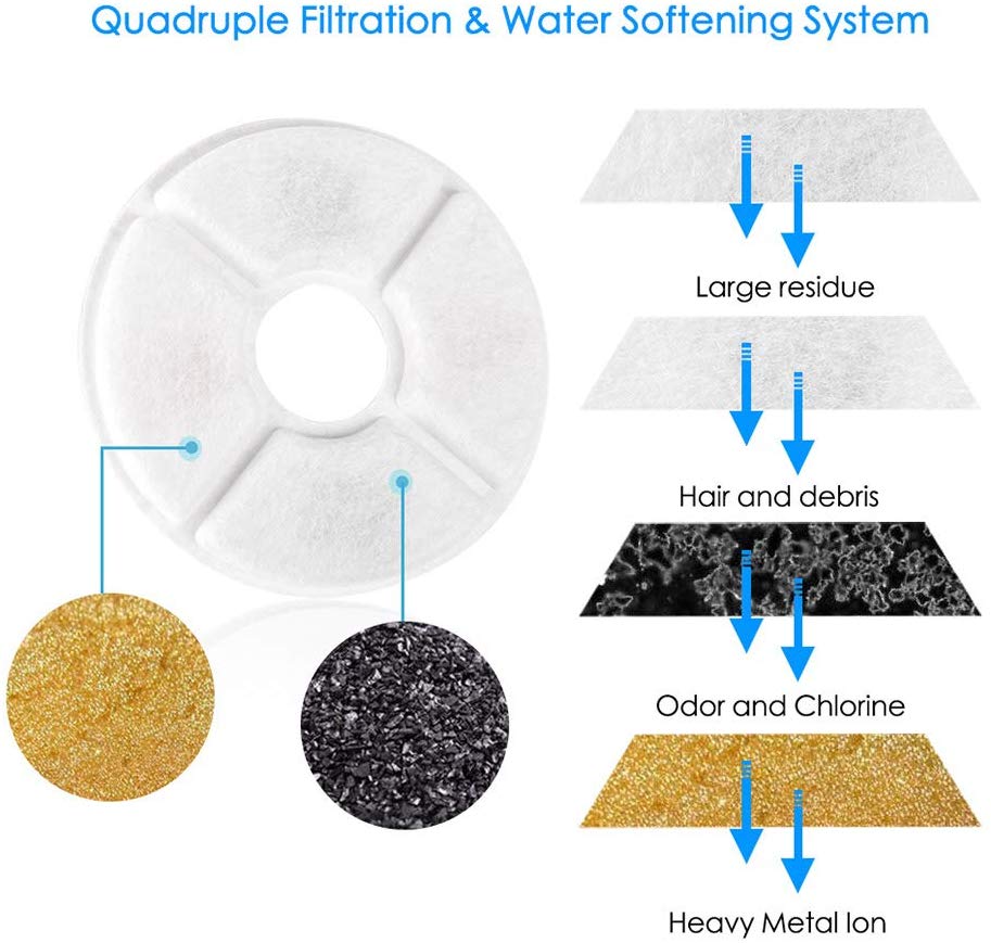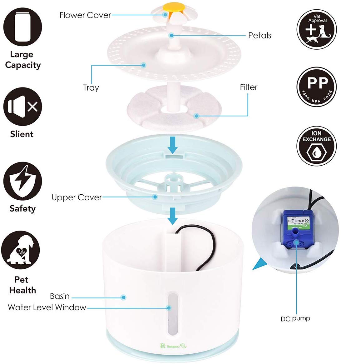 The Drinking Fountain is made of high-quality PP resin, which is BPA free and durable. We provide 3 replacement filters. The filtered water meets human health standards, so you can bid farewell to water quality problems. Moreover, the pump is ultra quiet and low consumption. The fountain’s color and flowing water will be your pet’s favorite, successfully attracting them to drink more often!